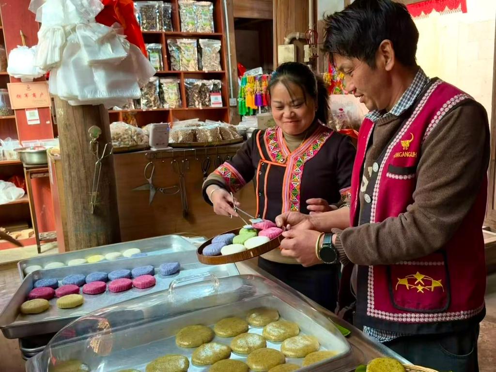 2026年1月27日,云南省腾冲市清水镇司莫拉佤族村村民李发顺夫妇正在为游客打包大米粑粑。
