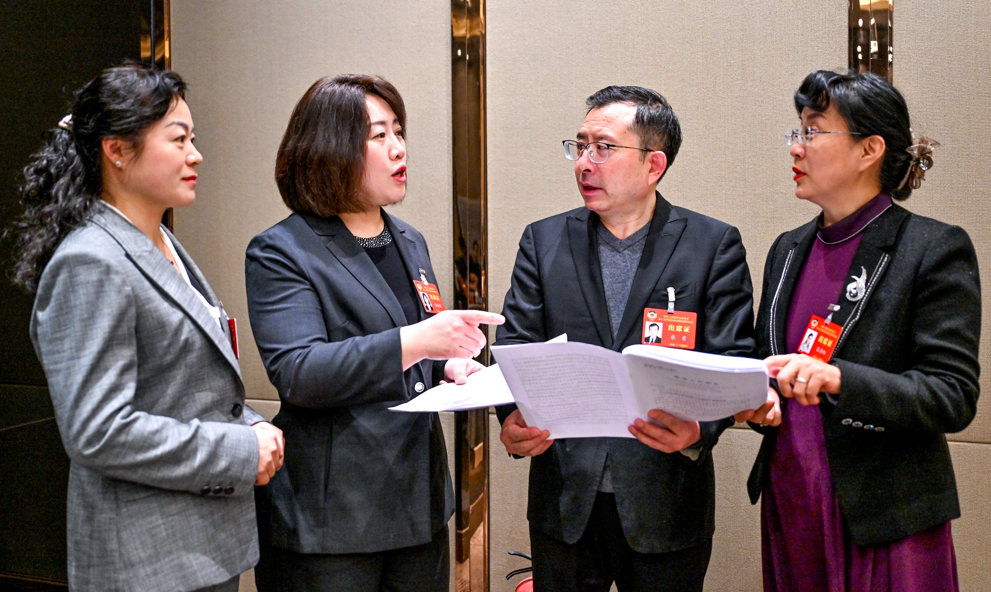 宁夏回族自治区政协全会期间,自治区政协委员利用会议间隙,就拓展绿能技术、构建零碳体系等话题展开讨论。(文/图 本报记者 范文杰)
