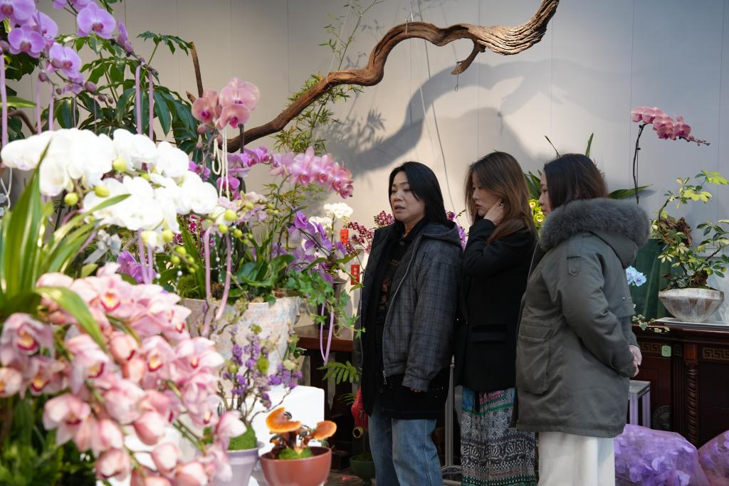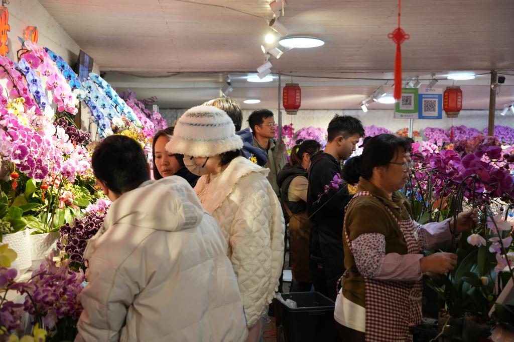 记者走进名为“家叶园艺”的店铺,各式年宵花琳琅满目。“每一株进来都要重新塑形、精选。”店主姚家叶指着一排排整齐挺立的兰花说,周末光一个品种就能卖两三百盆。