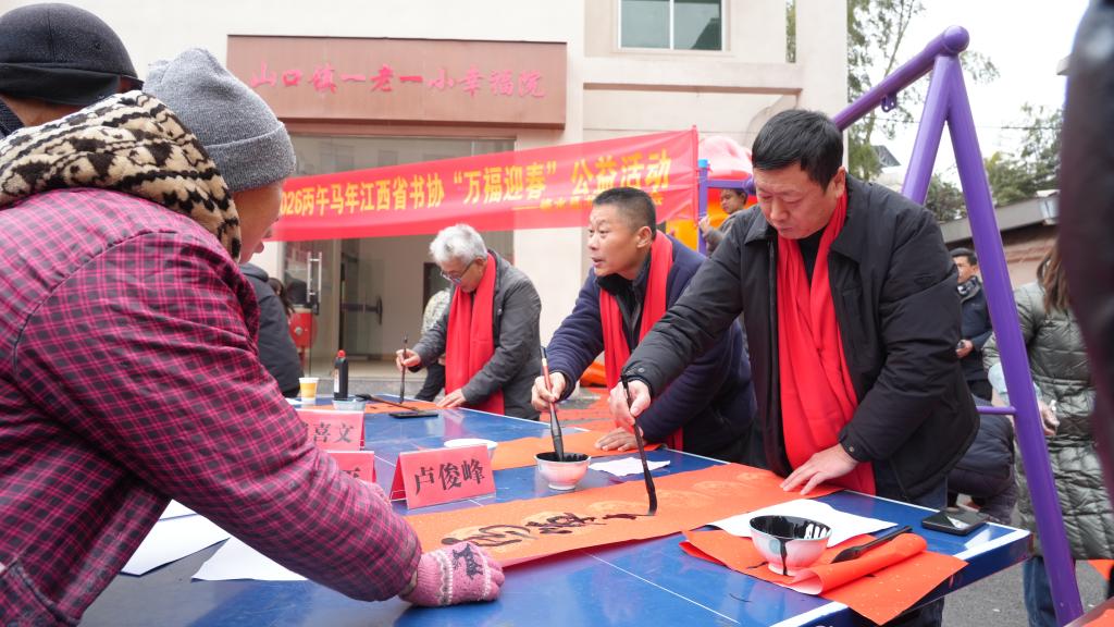 集市一隅,翰墨飘香。本次赶大集还设置了送春联活动,来自修水县书法家协会的书法爱好者现场创作,旁边满是等候春联的乡邻。“马腾盛世三春早,竹报平安万事兴。”书法爱好者吴正凡手持自己写的春联说,春节即将来临,希望通过送春联把新春祝福传递给更多人。