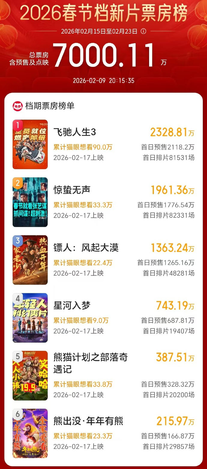 2026春节档新片预售票房破7000万