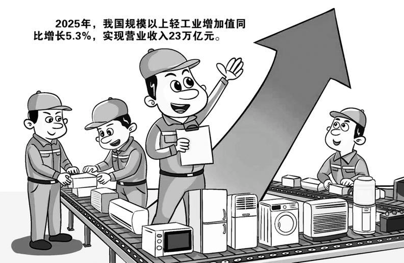 中国轻工业联合会近日公布2025年轻工业经济运行情况。数据显示:2025年,我国规模以上轻工业增加值同比增长5.3%,实现营业收入23万亿元。其中,轻工11类商品零售额86719亿元,同比增长7.8%。轻工商品零售额占社会消费品零售总额的比重为17.3%,较2024年全年提高1.1个百分点。图/王晨