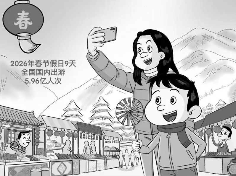 文化和旅游部2月24日公布2026年春节假期文化和旅游市场情况。春节假日9天,全国国内出游5.96亿人次,较2025年春节假日8天增加0.95亿人次;国内出游总花费8034.83亿元,较2025年春节假日8天增加1264.81亿元。假日游客人数和花费均创历史新高。图/王晨
