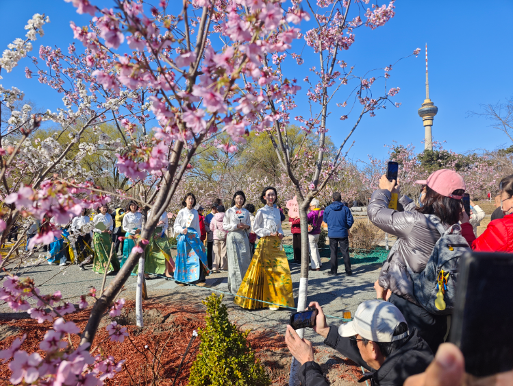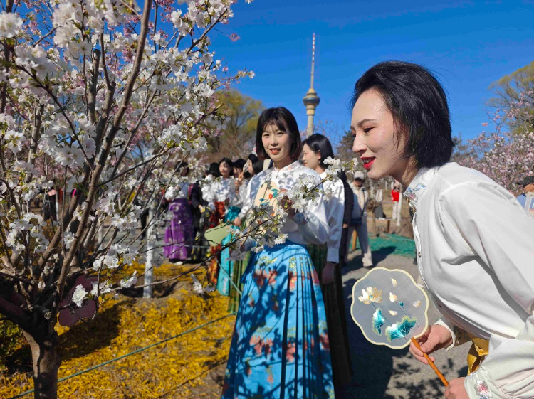 文化活动方面,公园推出多元展陈与互动体验。玉和集樱展室开设《此间春色》主题展,东湖北岸举办湿地生态、园林生态科普摄影展,展现首都生态建设成果。每周“樱花导赏”活动普及花卉、生态等科普知识,“小樱”IP生日会、巡游,以及非遗展示、国风快闪、T台走秀等特色活动,让游园兼具文化趣味与互动乐趣。