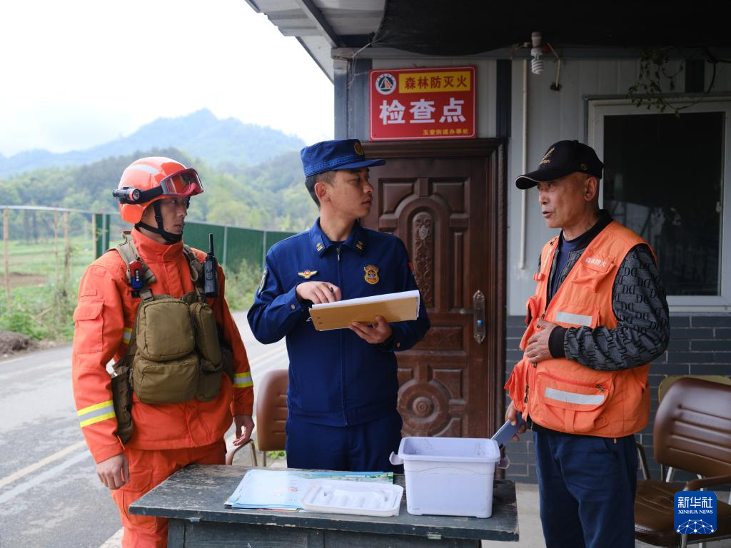 3月29日,消防救援人员(左、中)在都江堰林区入口进行防火检查。