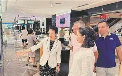 路平(左一)为白俄罗斯参赞介绍德航集团FLY3跨境(零关税)体验城情况。 (图片由受访者提供)