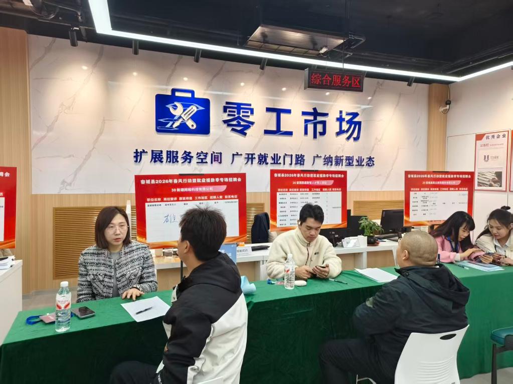 回迁居民在容东零工市场举办的专场招聘会上咨询岗位情况(2026年3月摄)。(受访者供图)