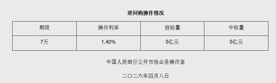 中新网4月8日电 据央行网站消息,2026年4月8日中国人民银行以固定利率、数量招标方式开展了5亿元7天期逆回购操作,全额满足了一级交易商需求。具体情况如下: