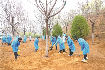 四月九日,全国政协机关在北京市房山区青龙湖森林公园开展以“履行植树义务、共建花园城市”为主题的义务植树活动。 王达 摄