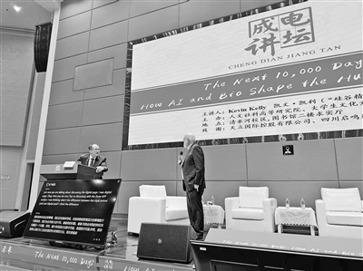 图为曾勇(左)正在讲座现场与凯文·凯利开展对话。