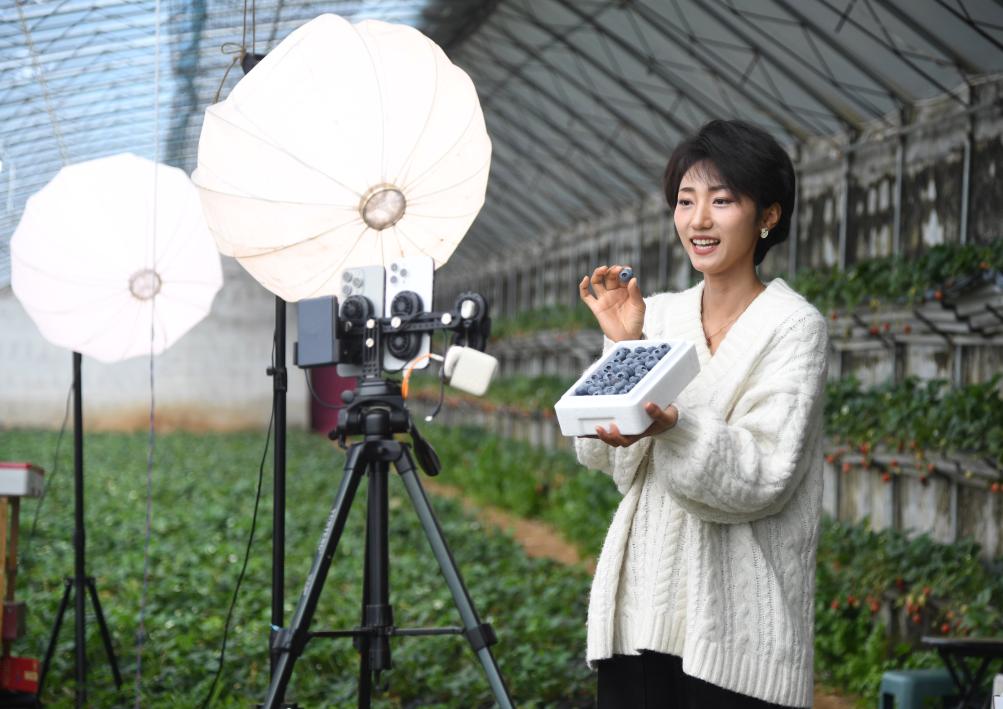 在北京市平谷区山东庄镇鱼子山村一处设施农业基地的大棚内,工作人员直播销售蓝莓。新华社记者任超 摄
