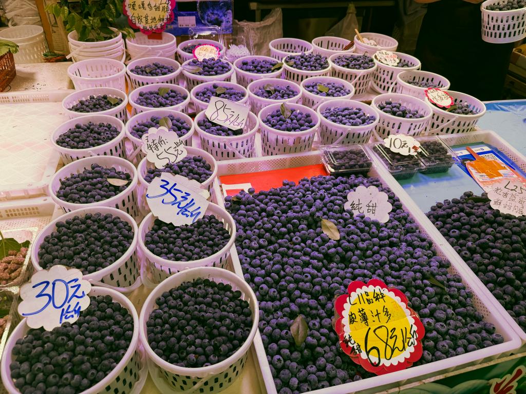 在云南昆明大观篆新农贸市场,来自澄江、蒙自等产地的蓝莓整齐摆放,近日价格集中在每公斤30元至60元区间,不少市民游客在蓝莓摊位前选购;千里之外的上海,消费者通过手机下单,次日就能收到云南直发的新鲜蓝莓,单盒125克的蓝莓价格降至十元出头。