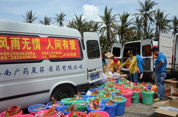7月26日,满载着民盟海南省委和海南广药晨菲医药有限公司、海南莱士单采血浆站及北京、深圳等地爱心人士对灾区人民关切之情的爱心车队向文昌市驶去。这次赈灾的物资主要以灾区群众急需的药品、消毒品和夏凉被、食用油、大米、水桶、毛巾、蚊香等生活用品为主,还为五保户和在灾区中失去亲人的家庭各送上了200元慰问金。在文昌市志愿者的带领下,赈灾服务队分赴翁田镇11个村庄和罗豆农场4个村庄慰问救助,把慰问品直接送到500多户受灾群众手中。同时,向岛外及当地电力抢修队伍赠送饮料200箱和清热解暑药品。民盟海南省委医卫专委会的医生还随队为灾区群众开展医疗救助。(民盟海南省委)