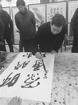 近日,中共河南汝阳县委统战部举办了汝阳县统一战线“迎新春·同心颂·统战情”书画作品展。中共县委常委、统战部部长朱晓伟,县政协副主席袁树勋出席开幕仪式。全县书法绘画名家和爱好者、部分政协委员和文艺界人士、统战系统成员单位、部分企业家、各乡镇统战委员等160余人参加书画展。经过一个多月时间准备,全县40余名书画名家精心创作了各类题材、风格不同的书画作品60余幅。图为书法家刘照渊在现场创作。