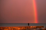 巴塞罗那海滨暴风雨后浪漫美景:情侣彩虹下拥吻