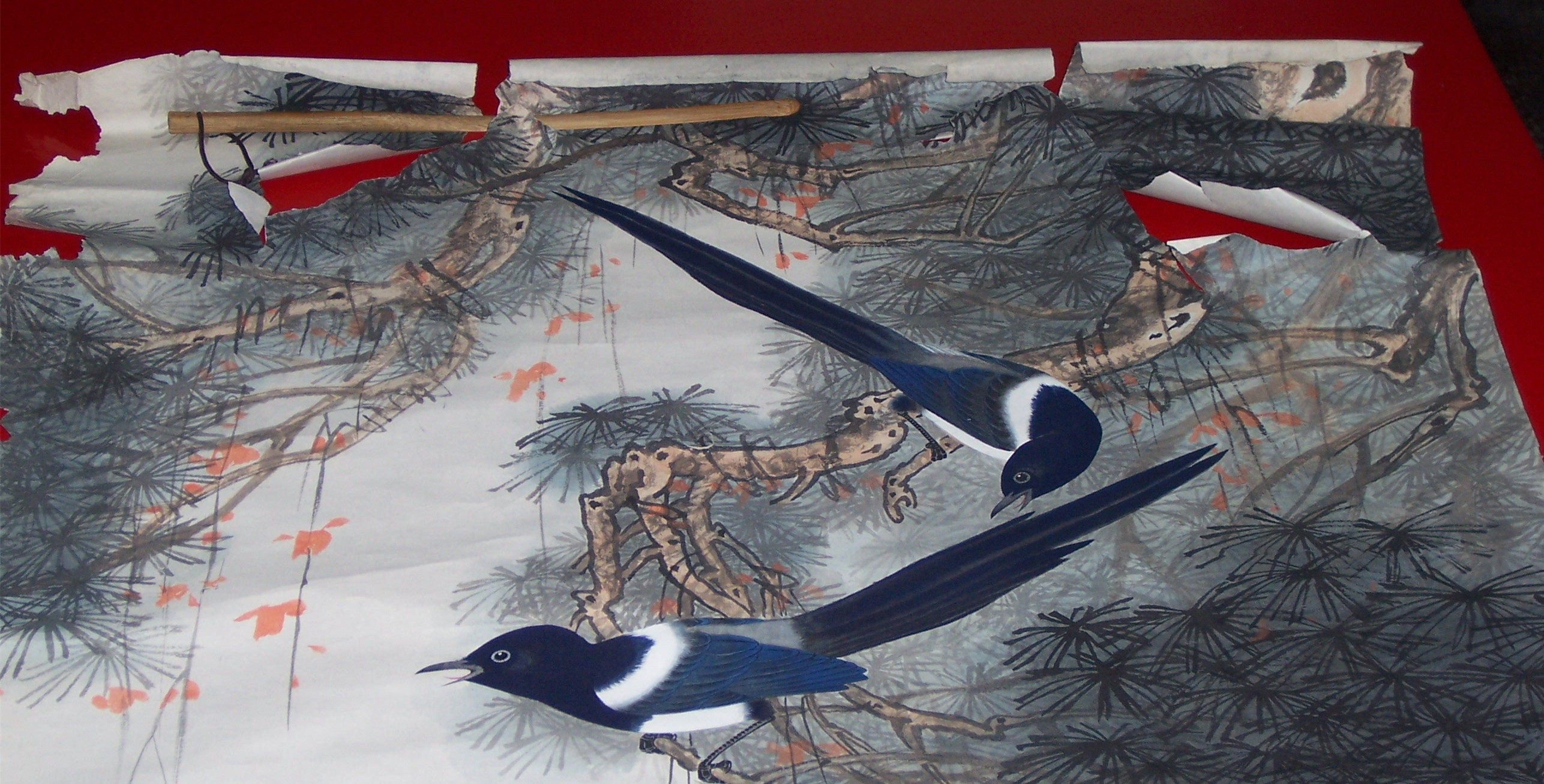 “其实,装裱者就是画医,画郎中。中医讲要标本兼治,因此,作为画郎中,要先保本再治标。本就是画心,也就是,要最大限度保护好画心的质地不受伤害。”王旭说:“卷轴的命纸我觉得是能不揭,就不揭。命纸对画心来说是性命攸关的。经过多年的沉积命纸上承载着画面的灵魂。轻易地揭去命纸画面的神将暗淡,气也不畅,是致命的硬伤。如果命纸脱落而质地上好,还要尽可能地在原命纸和画心之间把命纸重新复原原位。这样,可能揭裱后的厚度要厚些,但画面精气神却不会损伤。”