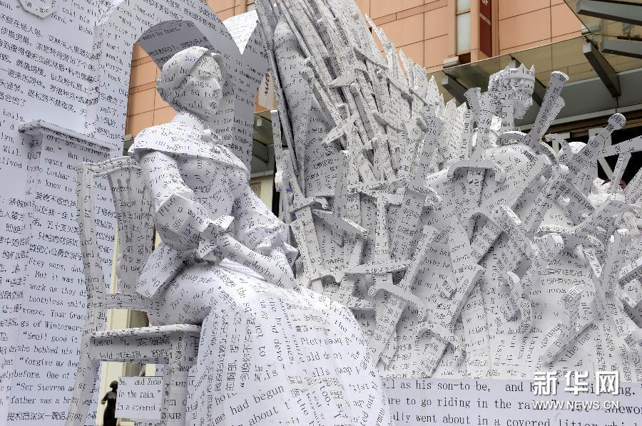 4月12日在王府井大街拍摄的大型纸质雕塑《冰与火之歌》。