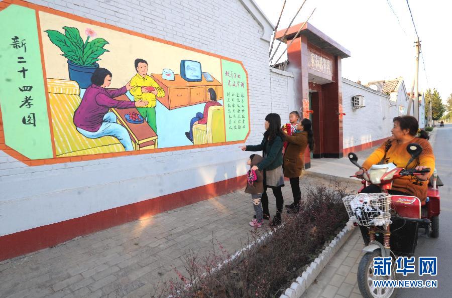 新华社照片,霸州(河北),2014年10月27日 河北霸州创作新二十四孝图 10月27日,在河北省霸州市田各庄村,村民在观看《新二十四孝图》文化墙。近年来,河北省霸州市参照古代二十四孝图的表现形式,结合现代老年人的生活起居、个人情感、休闲娱乐、养生保健和社会关爱等多个角度编绘了《新二十四孝图》,并通过绘制文化墙、发放宣传画等方式,在社会中营造敬老爱老新风。新华社记者李晓果摄