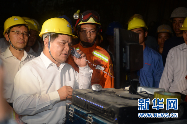 7月15日,云南省省长李纪恒在富宁隧道坍塌事故现场与被困人员通电话。新华社记者 胡超 摄