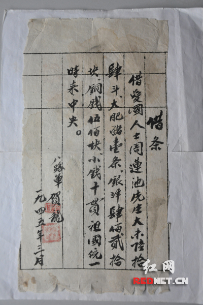 湖南发现1945年八路军借条 盖有贺龙印章(图)