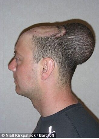 30岁的克里斯,13岁时发现头顶长脂肪瘤,去保加利亚做了多次手术,都未能清除所有肿瘤组织,令肿瘤重生,最终要割去23厘米头皮,将瘤割清,并嫁接大腿皮肤到头顶,却令前额秃发,7年来要戴帽示人。