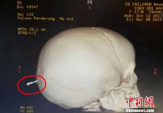 神经外科的住院医师郭宏溪接到晗晗的急诊后,立即对她进行紧急处理,通过头颅三维CT检查,发现钉子穿伤了颅骨2cm,没有穿破硬脑膜,于是对她进行了异物取出术。“如果受伤位置再往中间偏一点,就伤到了静脉窦,那里血管十分丰富,很容易大出血,产生颅内高压,会迅速致命。”郭宏溪说。