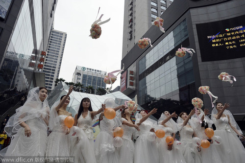 2014年11月9日下午2点,重庆南坪万达广场上演了一场特殊百米赛跑,没有跑道、没有裁判,10名貌美如花的女子,身穿白色婚纱,在人潮中你追我赶,形成一道亮丽风景线。“我是单身新娘,我不害怕单身!”她们一边奔跑,一边大声呐喊,向路人递送气球和捧花,引来不少市民驻足围观,替她们拍手加油。单身美女们将手中的鲜花抛向围观市民。