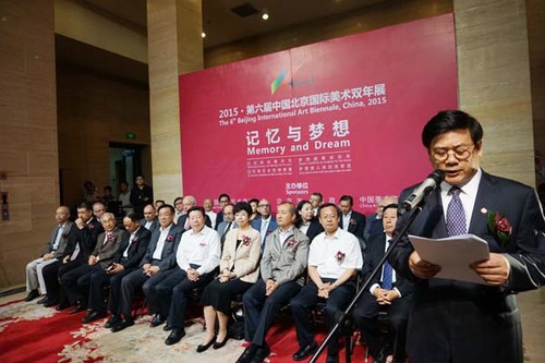9月24日上午,由中国文学艺术界联合会、北京市人民政府和中国美术家协会联合主办的“2015•第六届中国北京国际美术双年展”在中国美术馆开幕。出席开幕式的有原全国政协副主席、中国文联主席孙家正,中国文联常务副主席赵实,中国侨联主席林军,北京市委常委、宣传部长李伟,中国文联副主席夏潮,中国文联书记处书记陈建文,外交部部长行政司司长孙霖江,北京大学常务副校长吴志攀,全国政协常委、中国美协名誉主席靳尚谊,中国文联副主席、中国美协主席刘大为,中国美术馆馆长、中国美协副主席吴为山,北京双年展策展会顾问、北京双年展国际研讨会总主持邵大箴,中国美协副主席何家英、曾成钢,中国美协秘书长徐里,副秘书长陶勤、杜军,北京市文化局局长陈冬、副局长关宇,各参展国驻华使馆代表及各国200余位参展代表。