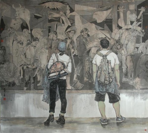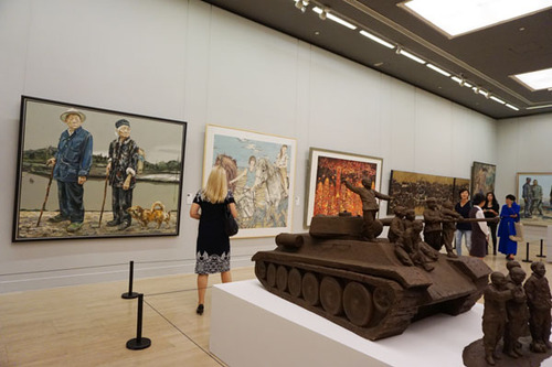 中国艺术家郭润文的油画作品《长夜》,以写实技法,描绘了一个前苏联红军的青年战士形象。前苏联红军为抗击法西斯做出巨大贡献,给一代中国人留下了不可磨灭的记忆,2015年是反法西斯战争胜利70周年纪念,这幅作品是对那段记忆的回望,也寄托了作者对于世界永久和平的愿望。国画家刘艺青的《向大师致敬》,则以毕加索的《格尔尼卡》与蒋兆和的《流民图》为背景,意在追忆前辈,以特有的方式记录了战争给平民带来的灾难和对法西斯的控诉,警醒世人牢记历史,爱好和平。