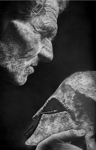希腊艺术家尼古劳斯•M•伯奇尔斯(Nikolaos M. Bokeas)的入选作品为《头盔》,作品灵感源于瑟尔默派勒斯一位古代英雄的形象和他所做出的牺牲。从画面中可以看到一个现代人手举着圣杯,“记忆”深深地烙印在生锈的头盔上,镌刻在这个具有创造力又热爱和平的人那张布满皱纹的面庞上。他的双手托举着世世代代人们关于自由、繁衍、丰收以及创造的种种梦想,提醒观者忘却历史的文化不会长久。澳大利亚艺术家安纳斯塔西娅·康托古瑞斯作品《犹太人区的孩子》表现的是,在二战时期的华沙犹太人区,一个挨饿儿童蜷缩在凳子上乞求食物的情景。据不完全统计,有超过一百万犹太儿 童成为纳粹大屠杀的无辜受害者,在当时的恐怖阴霾中,他们梦想着有一个安全的世界,梦想着父母温暖而又安全的臂膀。他们的梦想最终未能实现,留给了今天的我们。作品真切传递了作者对美好明天的期望和梦想。