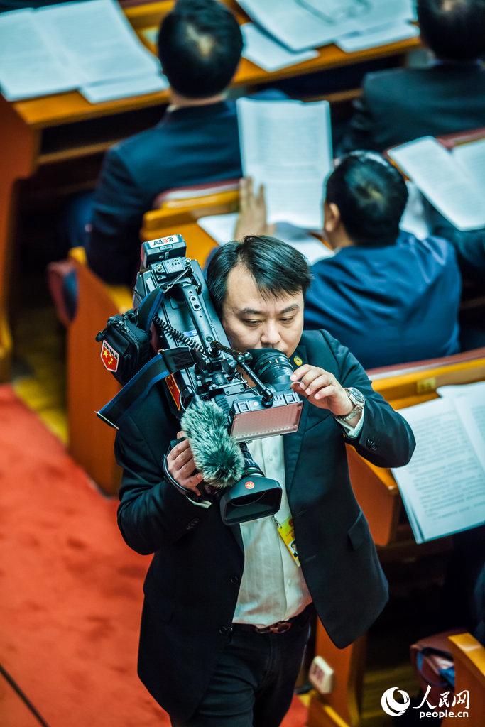 2015全国两会进行中,记者拍摄在人民大会堂一层的摄影师们。 在人民大会堂一层拍摄的摄影师在工作中。郑亮/CFP