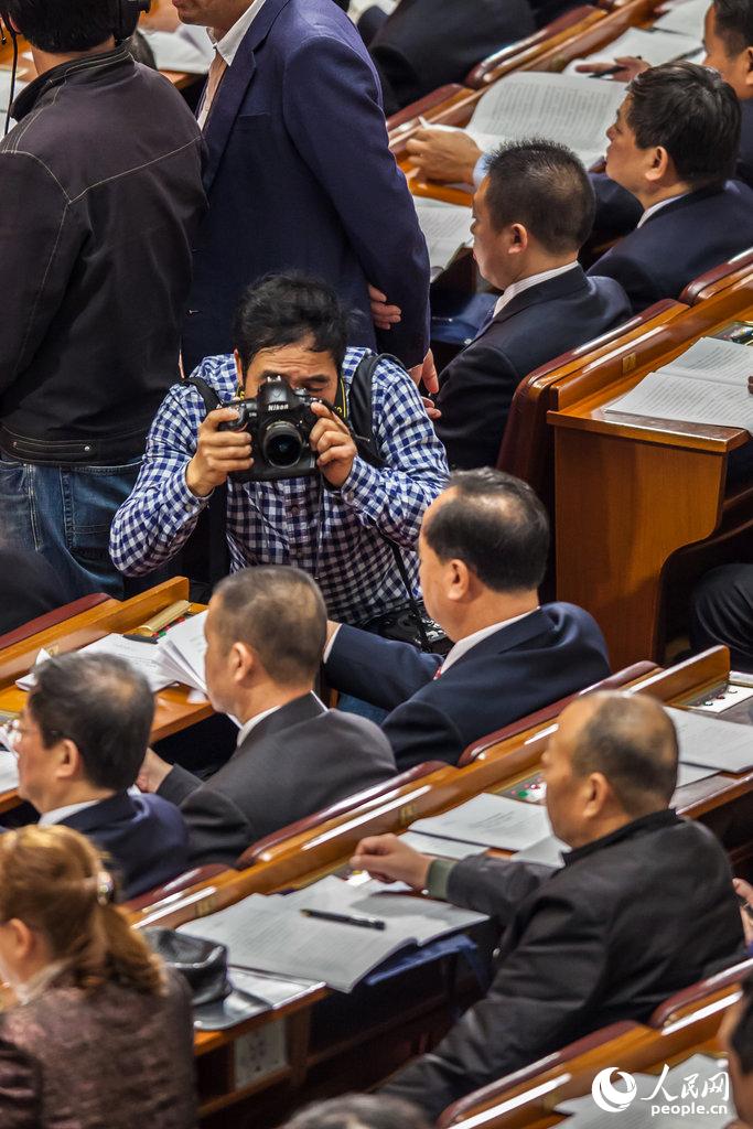 2015全国两会进行中,记者拍摄在人民大会堂一层的摄影师们。 在人民大会堂一层拍摄的摄影师在工作中。郑亮/CFP