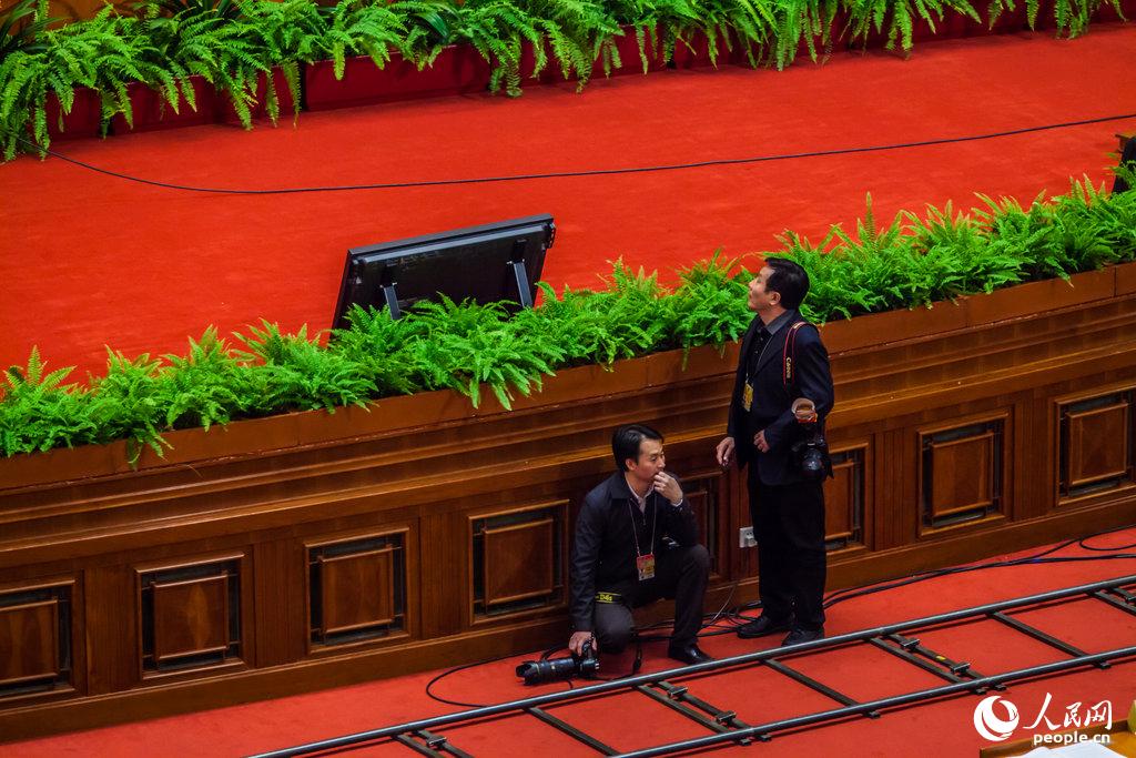2015全国两会进行中,记者拍摄在人民大会堂一层的摄影师们。 在人民大会堂一层拍摄的摄影师在工作中。郑亮/CFP