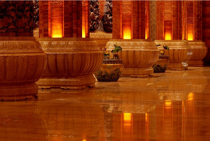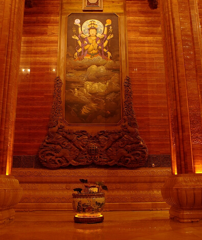 两侧16根高大雄伟的廊柱间,十二幅名为“世界佛教传法图”的巨幅油画,每幅高达12米。
