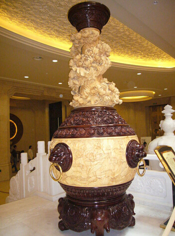 门厅入口两旁放有一对近四米高的白木雕花瓶,为东阳木雕大师陆正光的杰作。