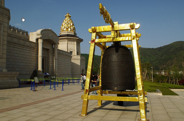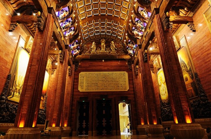由门厅打开的那扇侧门,即可进入气势恢弘的梵宫内部。这儿是梵宫的廊厅,廊厅是由门厅进入圣坛的交通厅,整个廊厅为拱顶结构,高18米,长度近80米,中部被塔厅分为两段,全部采用金丝楠木雕刻而成。