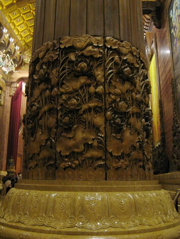 由这些合抱粗的巨型廊柱就可以看出梵宫规模之宏大,廊柱底部这些图案均采用东阳木雕透雕工艺。