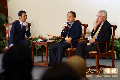 25日,在第四届世界佛教论坛上,诺贝尔文学奖得主莫言及诺贝尔生理学和医学奖得主理查德.罗伯茨受邀共同与参会者对话。与会者认为,佛教在人类发展的很多层面发挥着作用,尤其是推动了文化交流和融合。