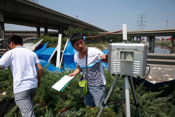 8月13日,在天津滨海新区危险品仓库爆炸现场外围,天津环境监测中心工作人员在监测环境。