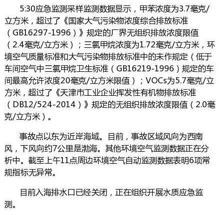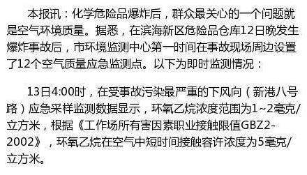 化学危险品爆炸后,群众最关心的一个问题就是空气环境质量。据悉,在滨海新区危险品仓库12日晚发生爆炸事故后,市环境监测中心第一时间在事故现场周边设置了12个空气质量应急监测点。(来源:天津日报)