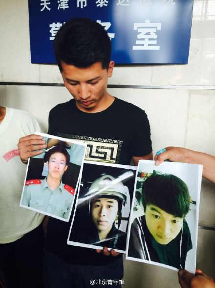 泰达医院陆续又有失联消防官兵的家属前来登记寻找,部分家属情绪激动。来自蓟县的彭先生举着哥哥和老乡的照片在现场登记求助,失联战士分别是22岁的彭德宝,21岁的李富越和21岁的蒙战利,供职于港区消防四中队。目前该中队仅有一名战士被找到。(北京青年报记者刘洋)