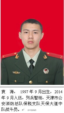据公安部消防局官方微博消息,14日,天津滨海新区危险品仓库爆炸事故又确认5名牺牲消防官兵的身份。他们是开发区公安消防支队副支队长王吉良、政治协理员江泽国,战士宁子默、林海明、李远航。