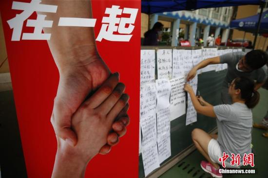8月14日,天津港“8·12”特别重大火灾爆炸事故民众安置点,志愿者为防止下雨,将墙上的寻人启事转移到黑板上。 中新社发 张浩 摄