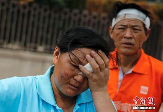 8月14日,几名从天津滨海新区爆炸现场逃离的外地农民工聚在天津滨海区街头,他们出来时没有拿任何衣物,身份证和手机都留在了爆炸现场,那个工厂距离爆炸地不到100米。 中新社发 张浩 摄