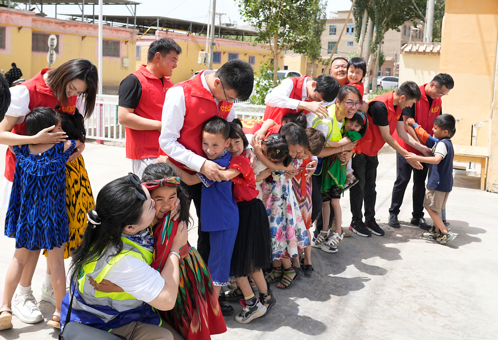 2023年,中建三局“建证未来”青年志愿者,为相识5年的新疆和田吉亚乡阿孜乃巴扎童梦幼儿园的小朋友们送去节日温暖,与孩子们共度“六一”。